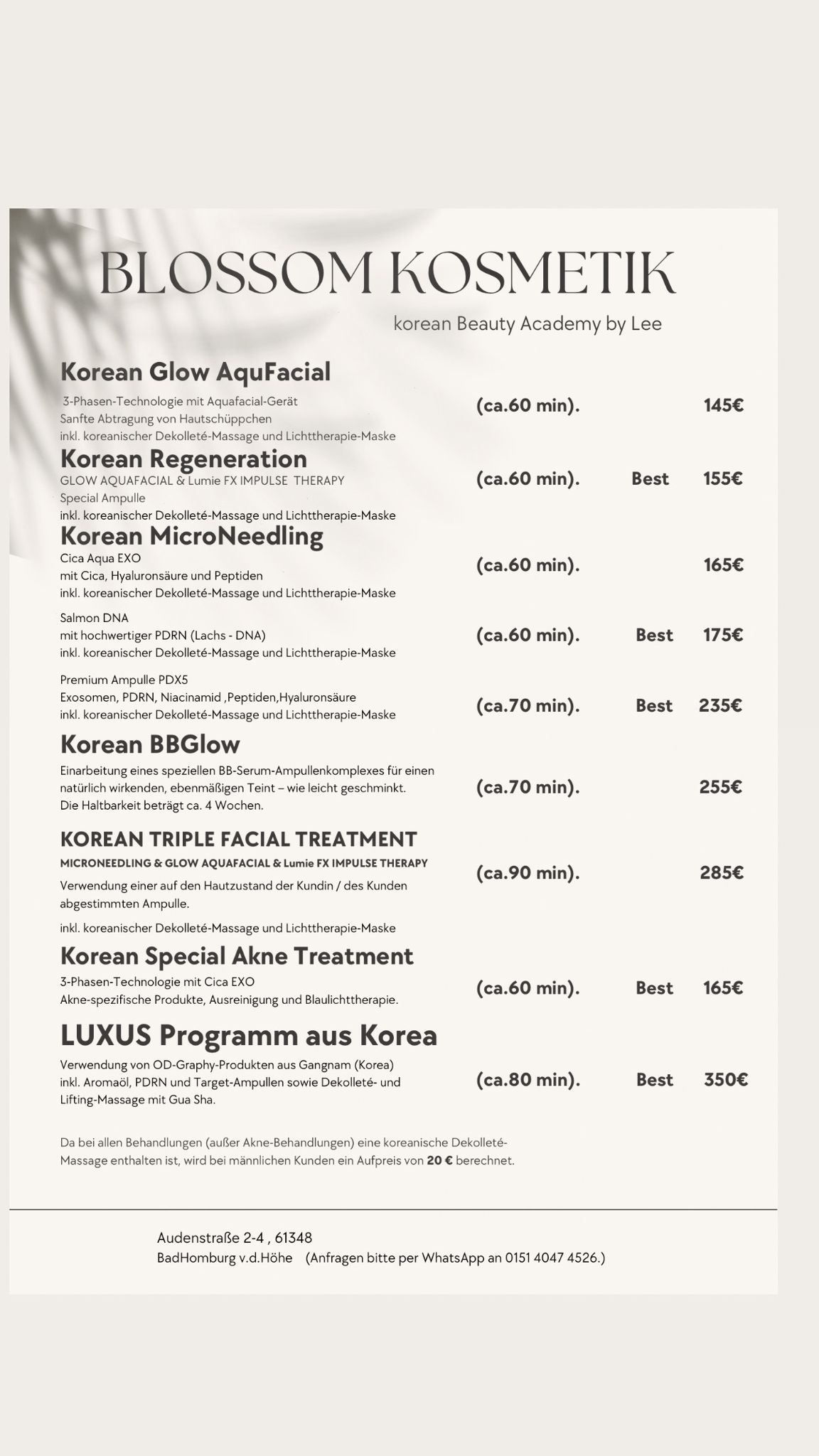Im Blossom Kosmetikstudio erwartet Sie mehr als eine klassische Gesichtsbehandlung. Als staatlich anerkannte Fachkosmetikerin mit koreanischen Wurzeln kombiniere ich hocheffektive Wirkstoffe aus meiner Heimat mit fundierter deutscher Hautexpertise.